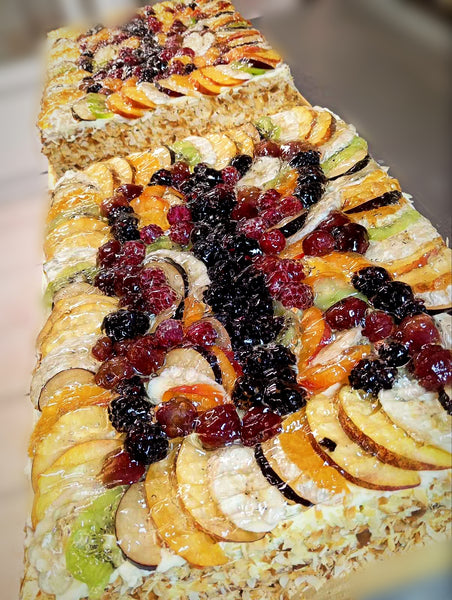 Нежен баварски крем с парченца банан е разстелен върху пандишпанени блатове. Тортата е отупана с филиран фъстък и завършена със сезонни плодове*.